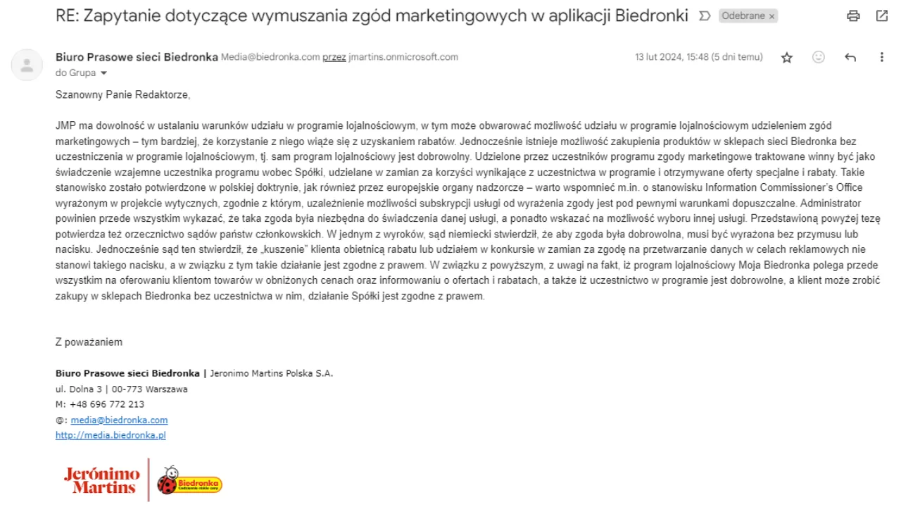 W odpowiedzi na pojawiające się wątpliwości rzecznik prasowy sieci Biedronka podkreśliła, że zgody marketingowe są traktowane jako element wzajemnej wymiany – klient zyskuje dostęp do korzyści, a firma otrzymuje zgodę na przesyłanie informacji marketingowych. W opinii przedstawiciela sieci takie działanie znajduje oparcie w polskiej doktrynie prawnej i zgodnie z interpretacjami europejskich organów nadzorczych jest dopuszczalne, o ile korzyści te są bezpośrednio związane z funkcjonowaniem programu lojalnościowego.